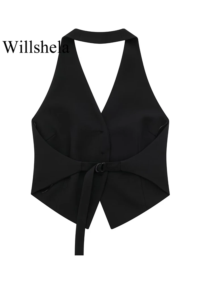 Willshela Women Fashion Black Backless Lace Up Waistcoats Vintage Halter Neck Sleeveless Jackets Female Chic Lady Tank Tops