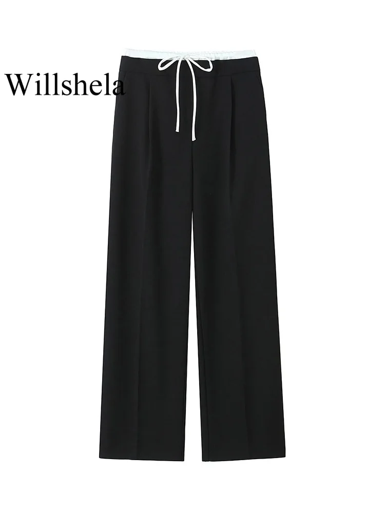Willshela Women Fashion Solid Lace Up Side Zipper Straight Pants Vintage High Elastic Waist Female Chic Lady Trousers