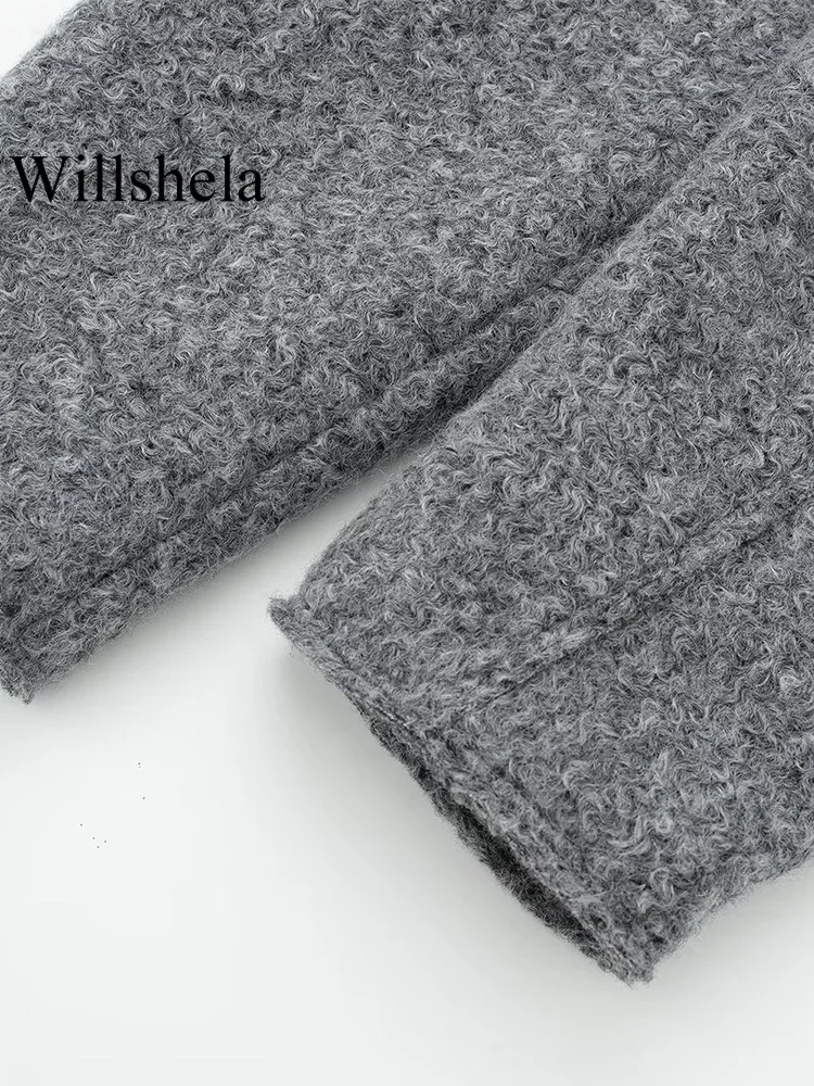 Willshela Women Fashion With Pockets Grey Front Zipper Jackets Vintage Lapel Neck Long Sleeves Female Chic Lady Outfits